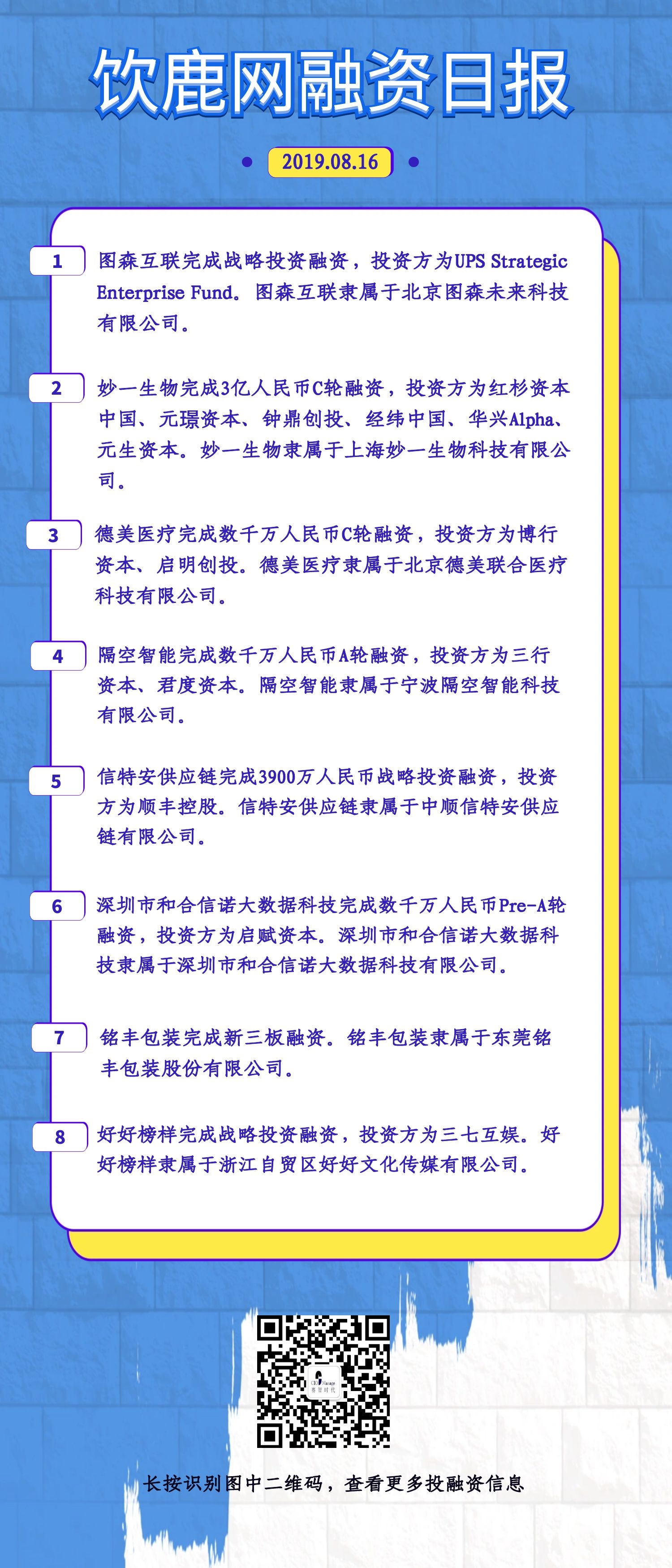 今天共有8条投融资信息,让我们恭喜图森互联、妙一生物、德美医疗、隔空智能、信特安供应链、深圳市和合信诺大数据科技、铭丰包装、好好榜样等企业获得融资!