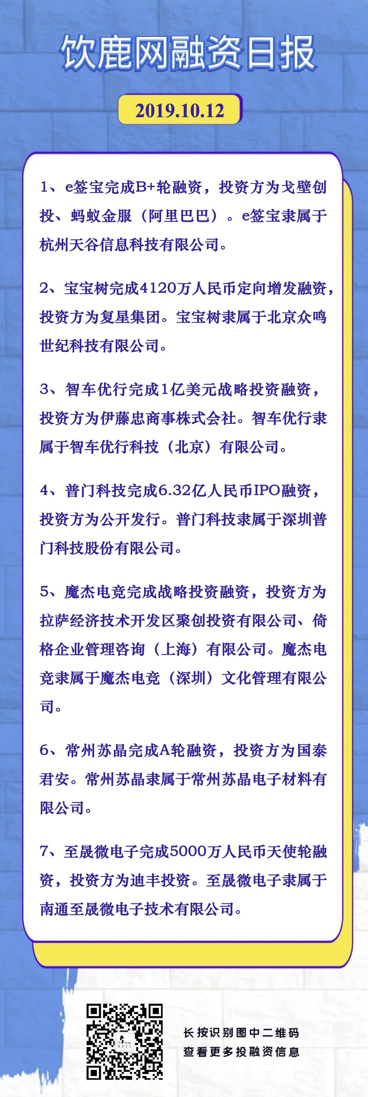 饮鹿网2019年10月12日投融资日报,