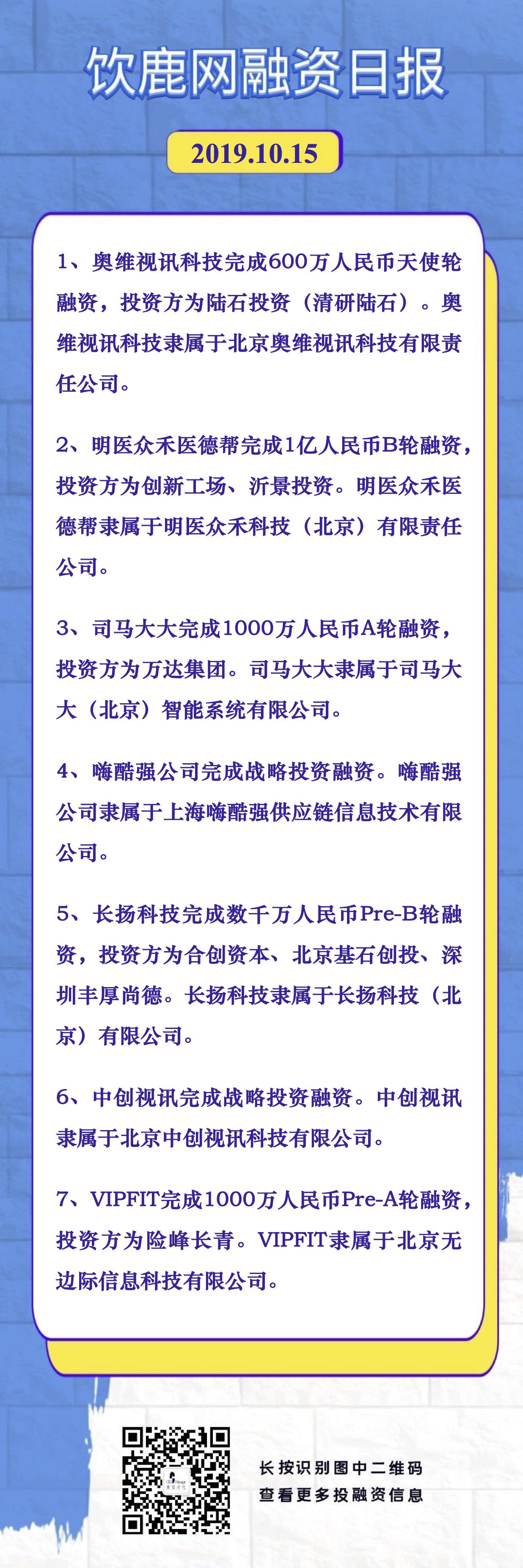 • 饮鹿网2019年10月15日投融资日报,