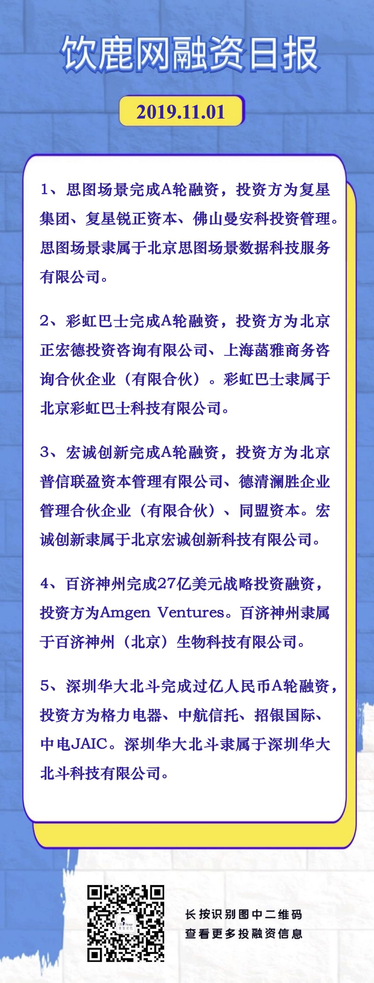 今天共有5条投融资信息,让我们恭喜思图场景、彩虹巴士、宏诚创新、百济神州、深圳华大北斗等企业获得融资!