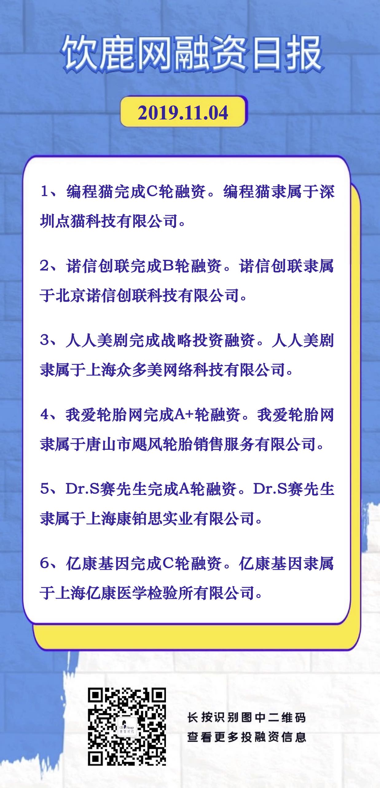 今天共有6条投融资信息,让我们恭喜编程猫、诺信创联、人人美剧、我爱轮胎网、Dr.S赛先生、亿康基因等企业获得融资!