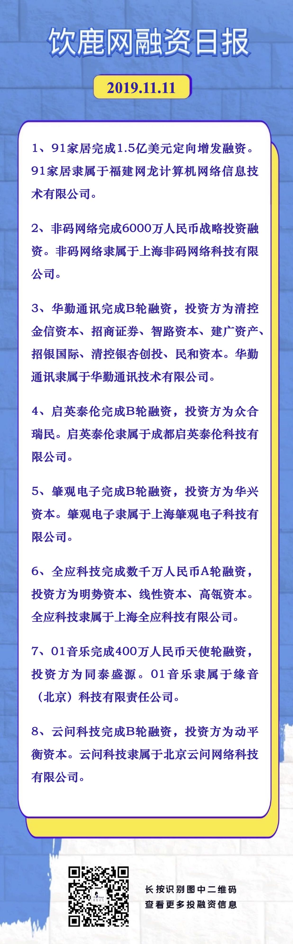 今天共有8条投融资信息,让我们恭喜91家居、非码网络、华勤通讯、启英泰伦、肇观电子、全应科技、01音乐、云问科技等企业获得融资!