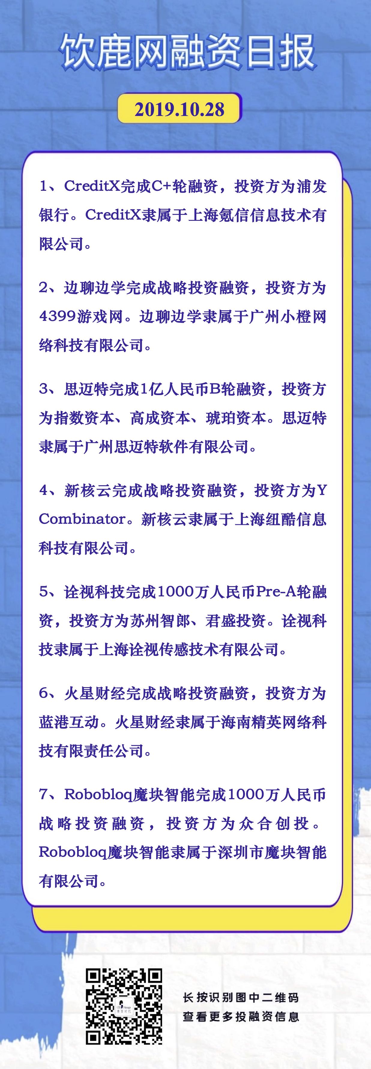 今天共有7条投融资信息,让我们恭喜CreditX、边聊边学、思迈特、新核云、诠视科技、火星财经、Robobloq魔块智能等企业获得融资!