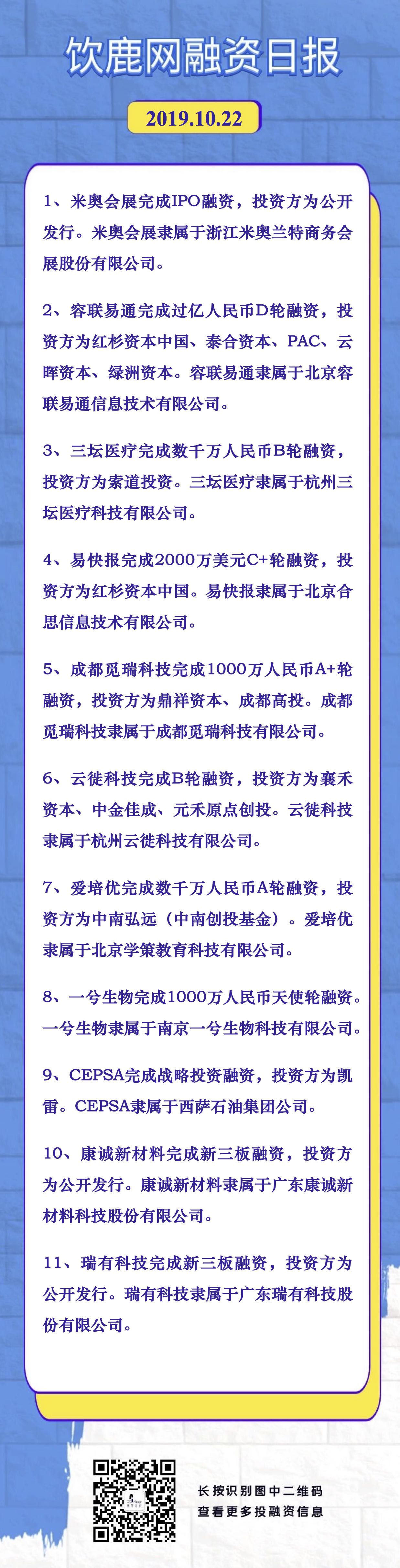 今天共有11条投融资信息,让我们恭喜米奥会展、容联易通、三坛医疗、易快报、成都觅瑞科技、云徙科技、爱培优、一兮生物、CEPSA、康诚新材料、瑞有科技等企业获得融资!