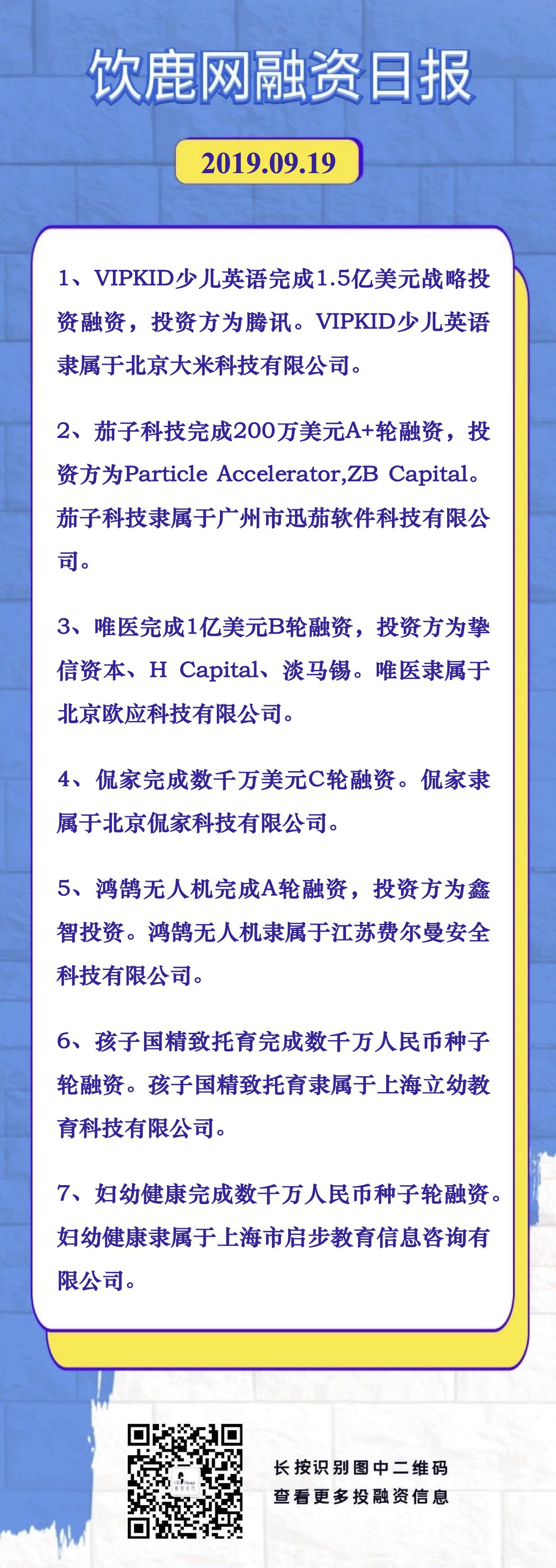 今天共有7条投融资信息,让我们恭喜VIPKID少儿英语、茄子科技、唯医、侃家、鸿鹄无人机、孩子国精致托育、妇幼健康等企业获得融资!