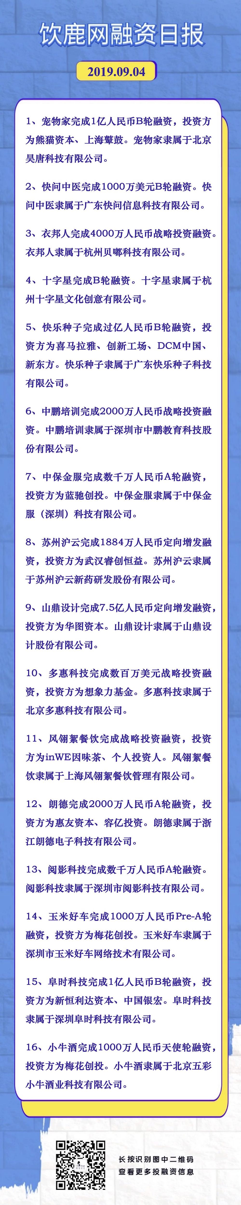 饮鹿网2019年9月4日投融资日报,