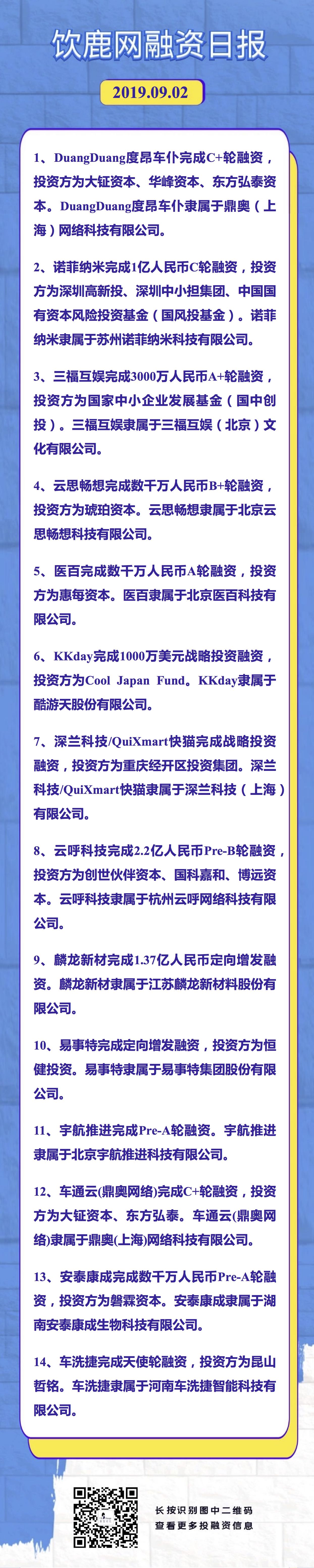饮鹿网2019年9月2日投融资日报,