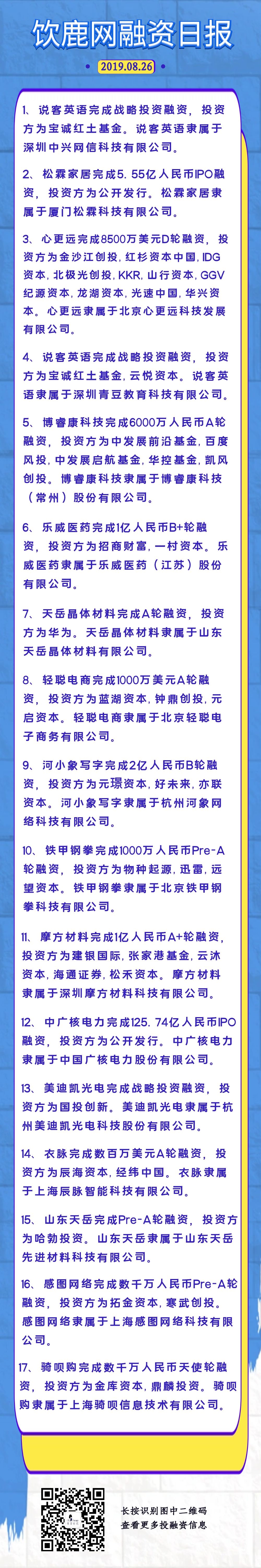 饮鹿网2019年8月26日投融资日报,